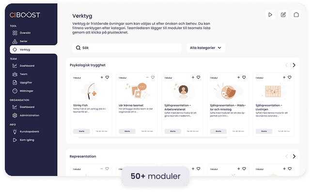 CIBoost gör det möjligt för organisationer att arbeta systematiskt och skalbart med något av det mest komplexa som finns – mänskligt samarbete. Genom korta, digitala reflektionspass – så kallade boost-sessioner – får team insikt i hur samarbetet fungerar, vad som kan förbättras och hur de tillsammans kan ta nästa steg.
